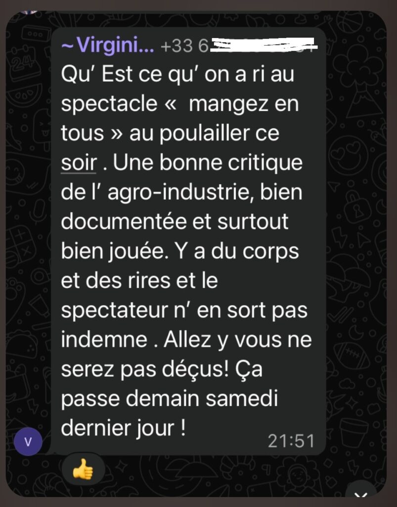Découvrez ce qu’a publié une spectatrice le vendredi 6 mars juste après avoir assisté au spectacle « Mangez-en tous » au Poulailler à Monestier-du-Percy (38) :